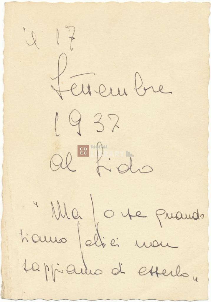 | iscrizioni | sul verso del supporto l'indicazione manoscritta: "il 17 settembre 1937 al Lido "Ma forse quando siamo felici non sappiamo di esserlo" |