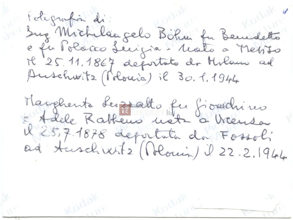 iscrizioni | sul verso del supporto l'indicazione manoscritta: "Fotografia di: Ing Michelangelo Böhm fu Benedetto e fu Polacco Luigia. Nato a Treviso il 25.11.1867 deportato da Milano ad Auschwitz (Polonia) il 30.1.1944/ Margherita Luzzatto fu Gioacchino e Adele Rabbeno nata a Vicenza il 25.7.1878 deportata da Fossoli ad Auschwitz (Polonia) il 22.2.1944" |