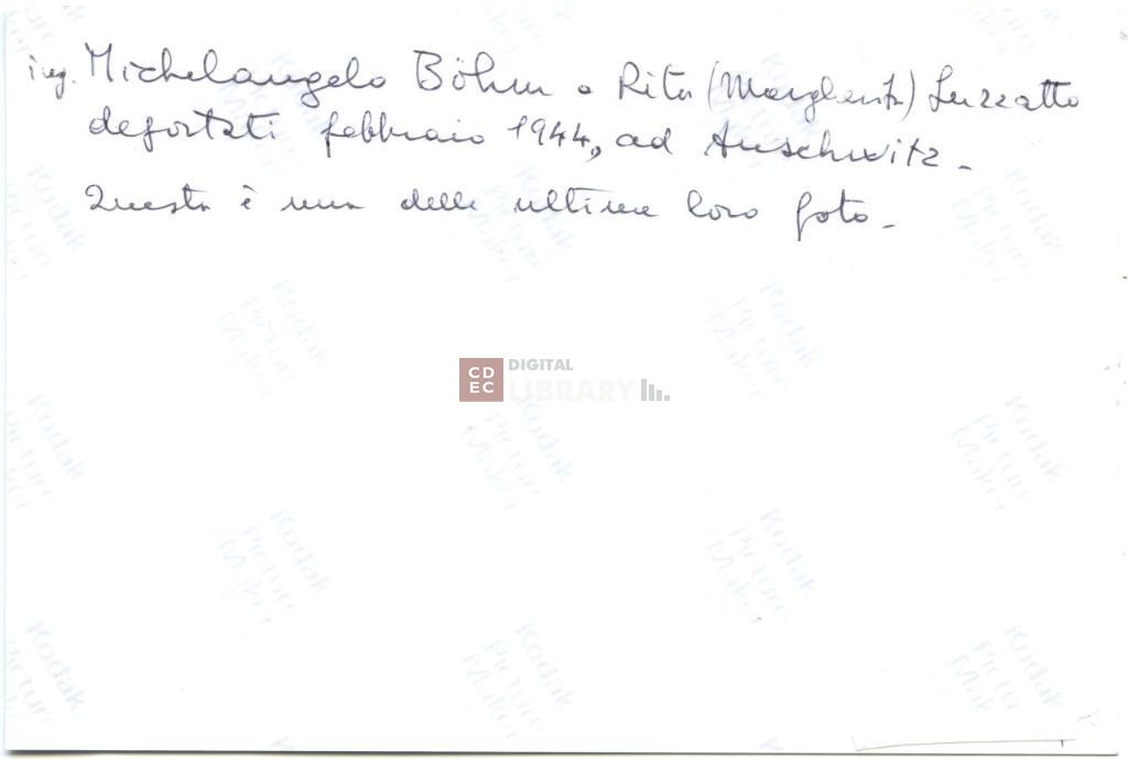 iscrizioni | sul verso del supporto l'indicazione manoscritta: "ing. Michelangelo Böhm e Rita (Margherita) Luzzatto deportati febbraio 1944, ad Auschwitz. Questa è una delle ultime loro foto." |