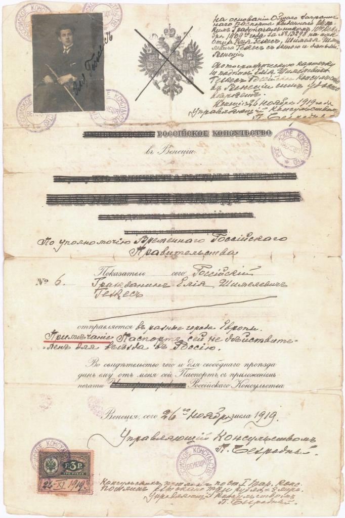 | osservazioni | Nella didascalia presente nel libro "Il posto delle capre" si sottolinea che il passaporto che Elia Gesess ottenne nel 1919 dal Consolato di Russia a Venezia "è scritto nella lingua russa usata prima della riforma ortografica del 1918, ora di difficile lettura". Inoltre nel documento è cancellata l'aquila imperiale. |