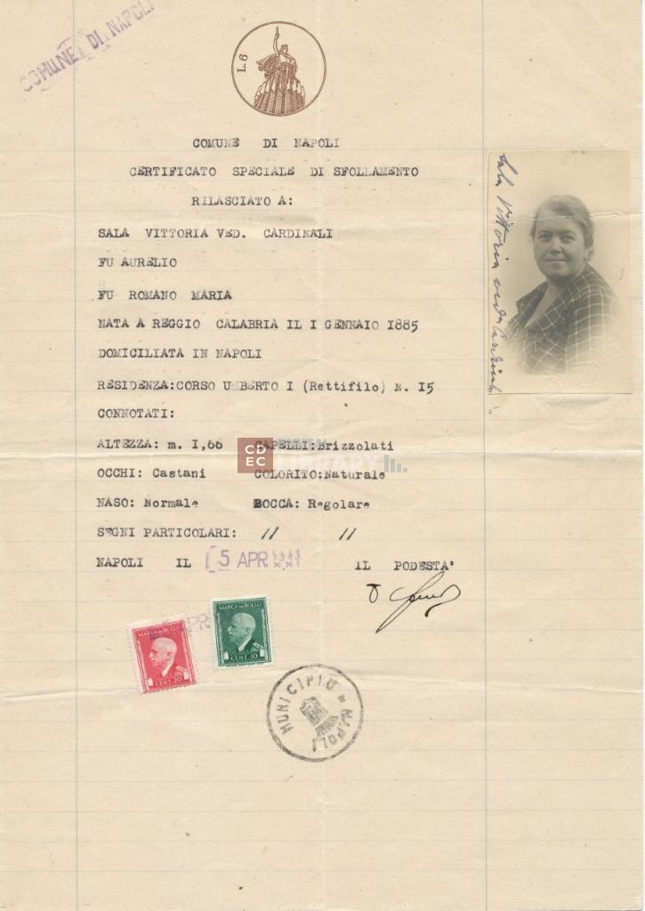 titolo attribuito | Certificato speciale di sfollamento di Sala Vittoria vedova Cardinali |