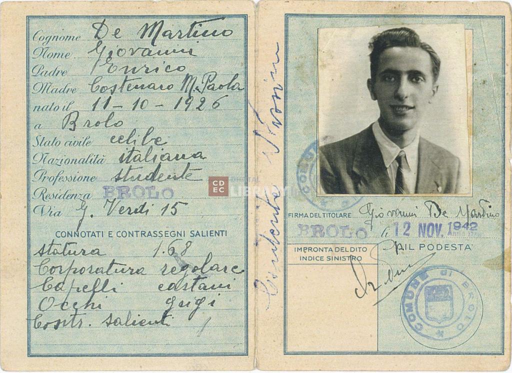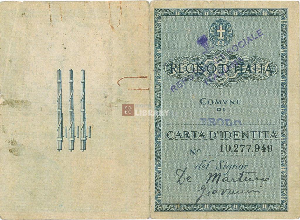 | notizie storico-critiche | La carta d'identità riporta l'indicazione di emissione del Comune di Brolo, in provincia di Messima; fu in realtà compilata dalla famiglia Contente con false generalità su documenti in bianco consegnatigli dal funzionario dei comuni di Canegrate e S. Giorgio su Legnano, come riportato nella documentazione allegata nel fascicolo d'archivio |