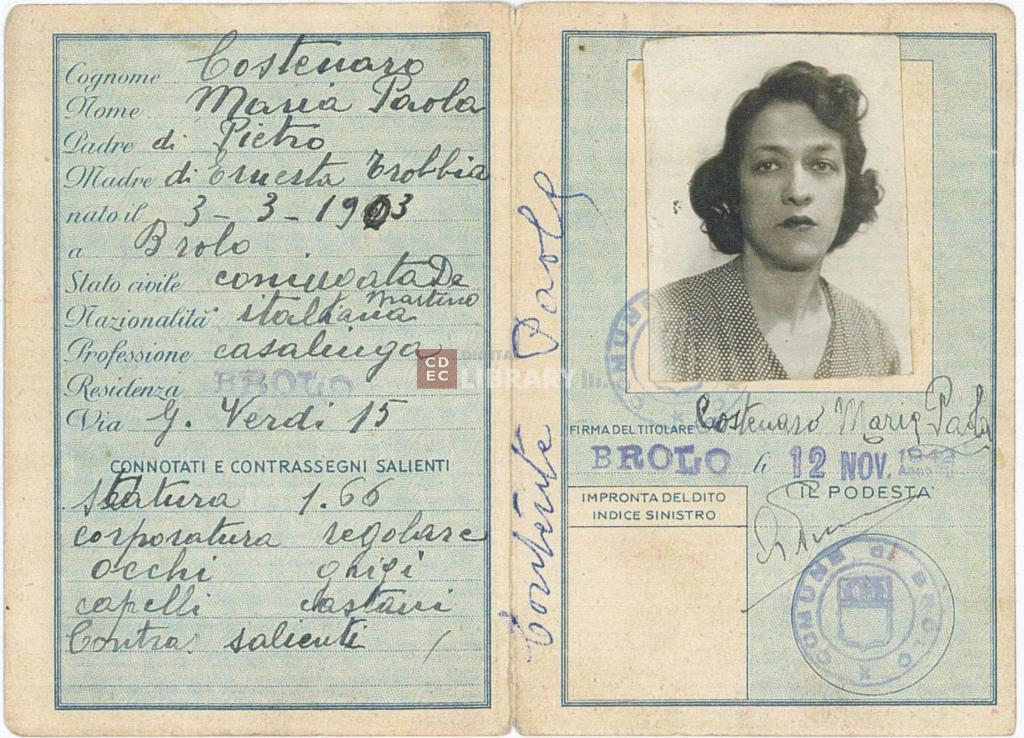 | notizie storico-critiche | La carta d'identità riporta l'indicazione di emissione del Comune di Brolo, in provincia di Messina; fu in realtà compilata dalla famiglia Contente con false generalità su documenti in bianco consegnatigli dal funzionario dei comuni di Canegrate e S. Giorgio su Legnano, come riportato nella documentazione allegata nel fascicolo d'archivio |