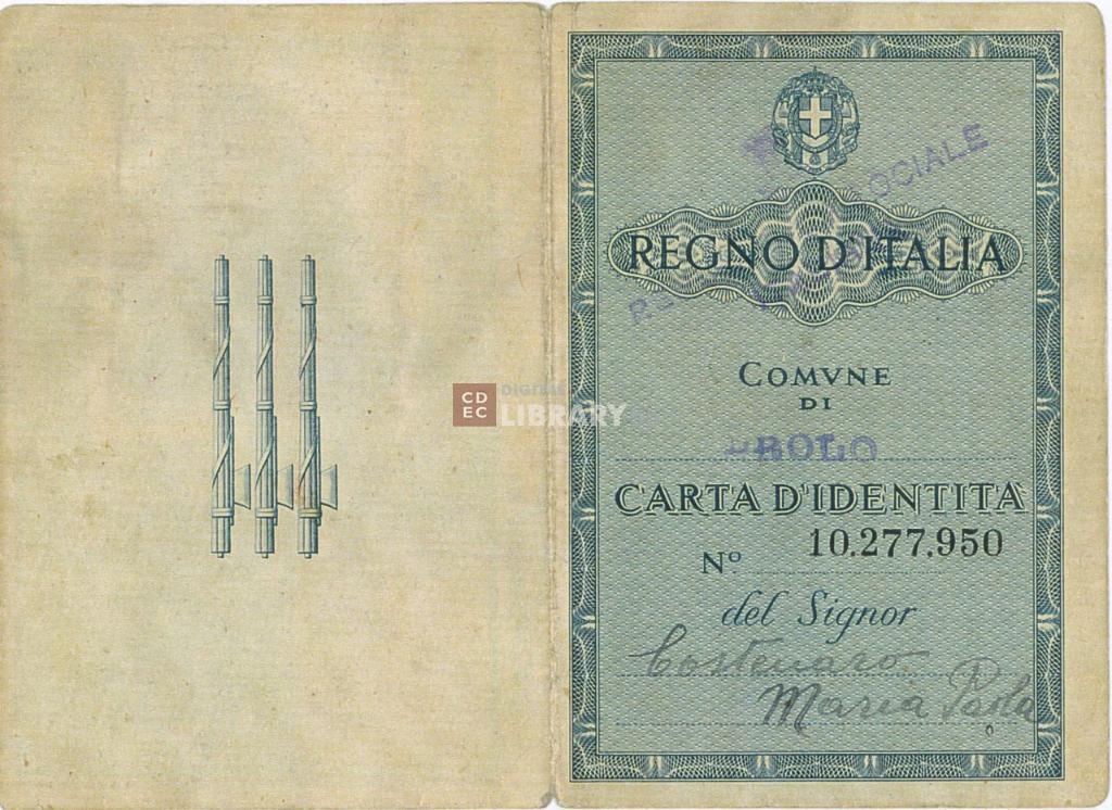 | titolo attribuito | Carta d'identità con false generalità di Paola Gaon in Contente (alias Maria Paola Costenaro) |