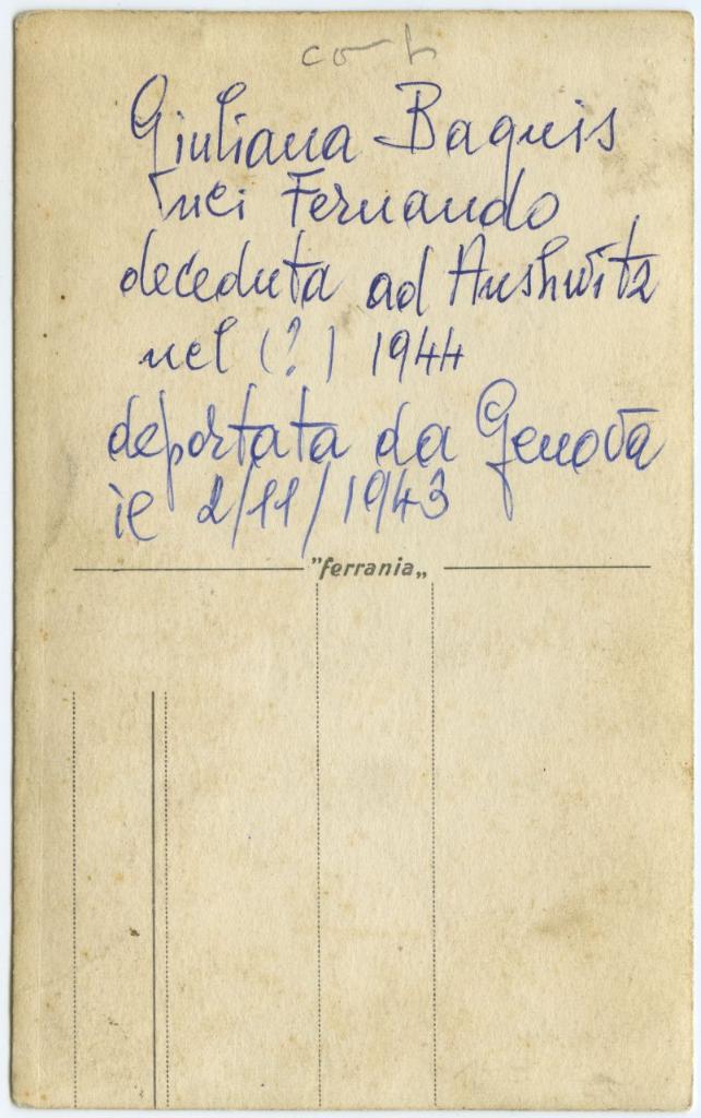 | iscrizioni | sul verso del supporto l'iscriizone: "Giuliana Baquis nei Fernando deceduta ad Auschwitz nel (?) 1944 deportata da Genova il 2/11/1943" |