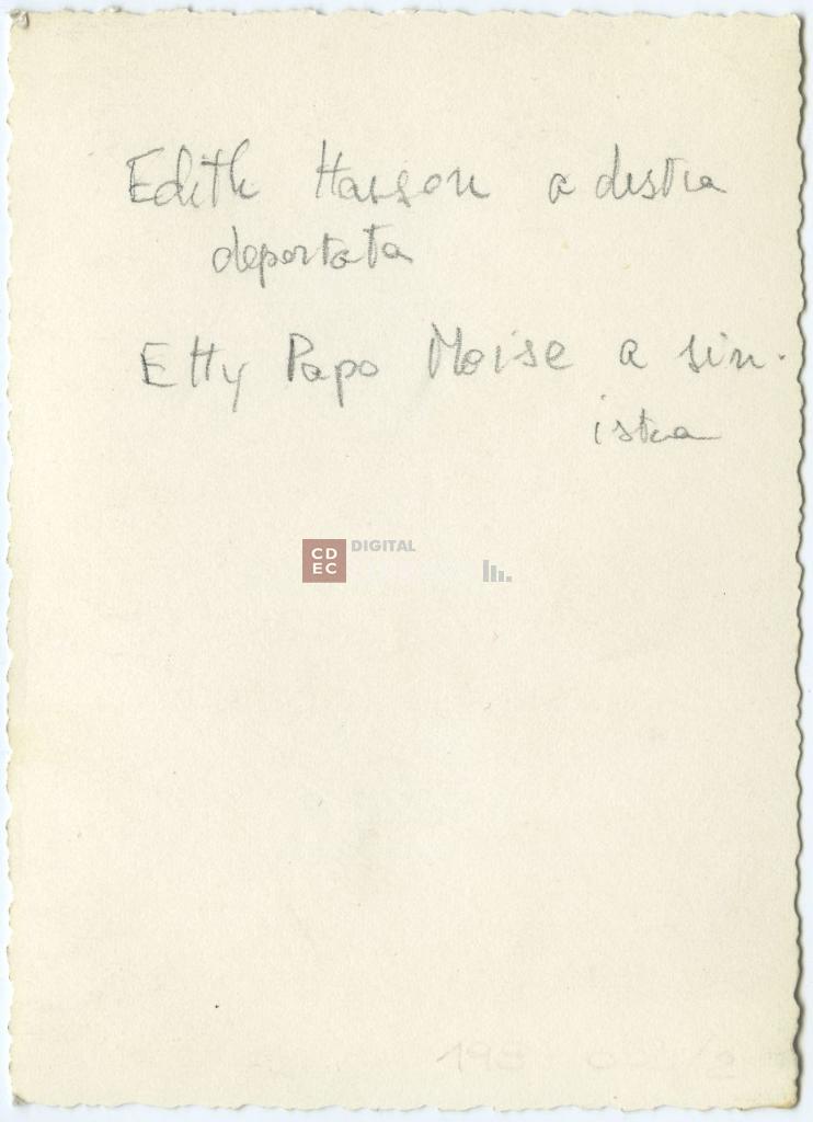 | iscrizioni | sul verso del supporto l'indicazione manoscritta: "Edith Hasson a destra deportata/ Etty Papo Moise a sinistra" |