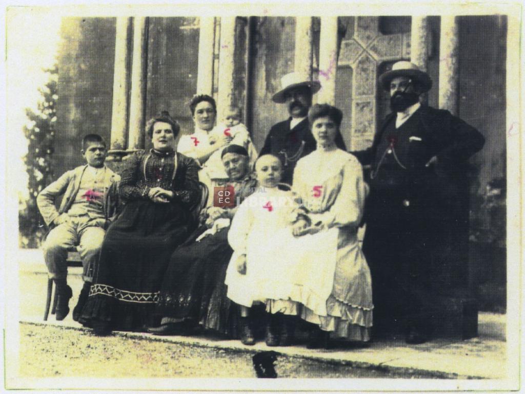osservazioni | Da sinistra seduti in prima fila: Giorgio Cuzzeri, Gilda Alpron in Cuzzeri, la madre di Gilda Alpron, bambina non identificata, Giselda Rita Santi in Rossi; in piedi in seconda fila la balia con in braccio Giuditta (detta Tina) Cuzzeri (poi coniugata Hamburger), Ernesto Cuzzeri e Giacomo Cuzzeri |