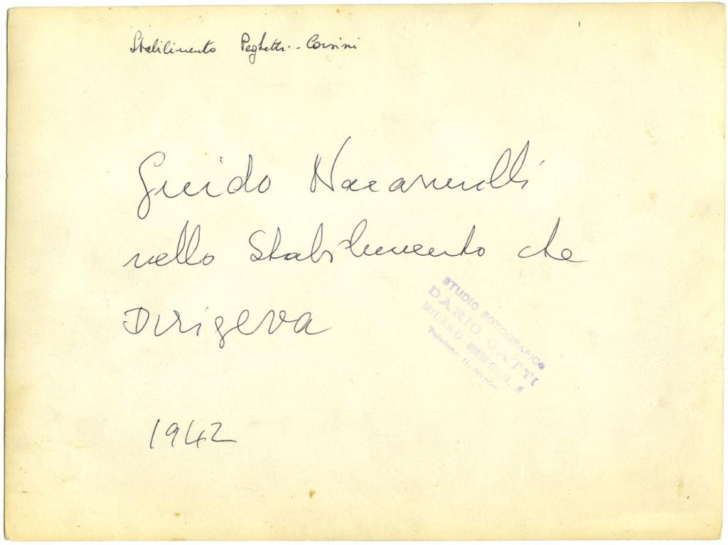 | iscrizioni | sul verso del supporto l'indicazione "Stabilimento Peghetti - Corsini" e manoscritta dalla donatrice Lilly Nacamulli "Guido Nacamulli nello Stabilimento che dirigeva/ 1942" |