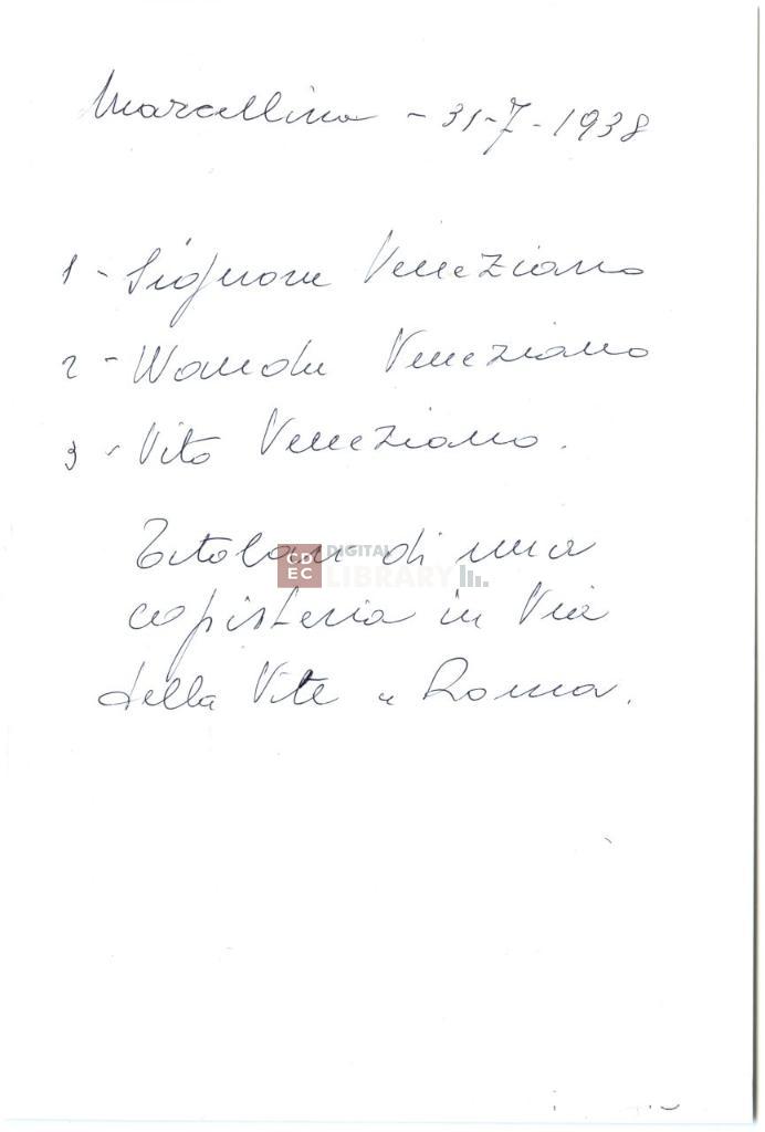 | iscrizioni | sul verso del supporto l'indicazione manoscritta "Marcellina - 31-7-1938/ 1 - signora Veneziano/ 2 - Wanda Veneziano/ 3 - Vito Veneziano/ Titolari di una copisteria in Via della Vite a Roma" |