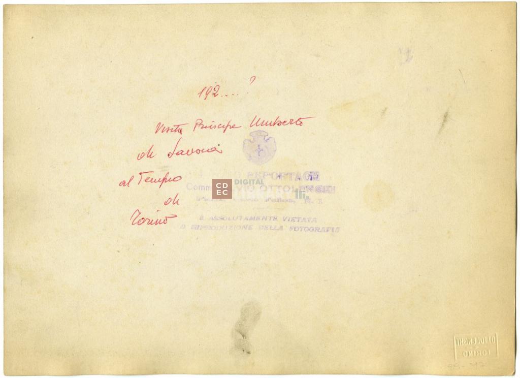 iscrizioni | sul verso del supporto l'iscrizione manoscritta a penna rossa: "192...? Visita Principe Umberto di Savoia al Tempio di Torino" |