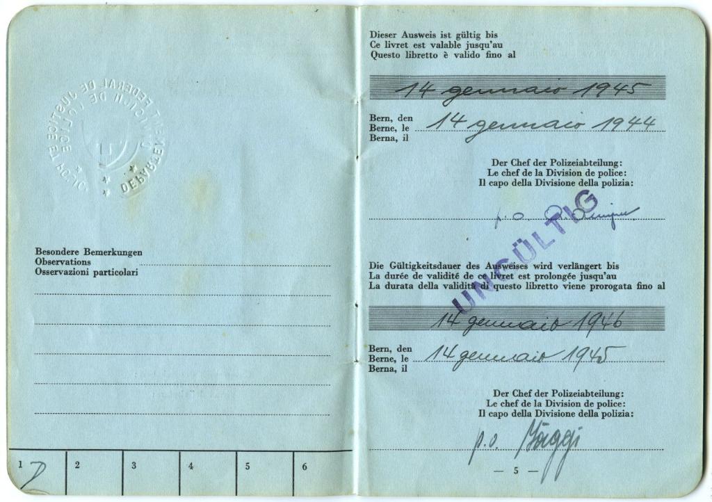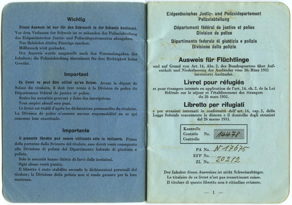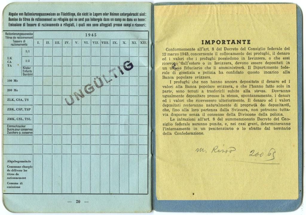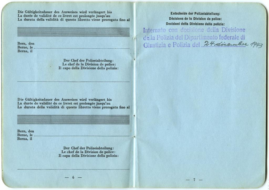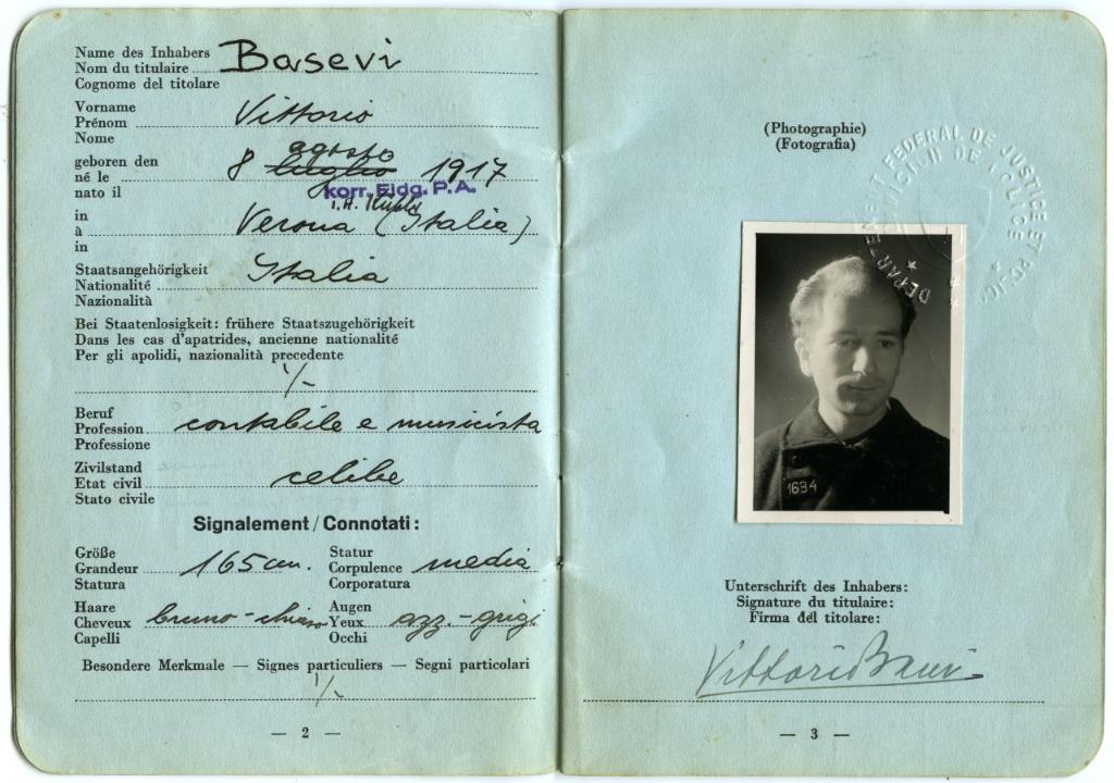| notizie storico-critiche | Vittorio Basevi viene internato con il numero di matricola "1634", come si legge sull'etichetta appuntata alla giacca, nel campo di Champéry (Valais). Sul libretto per rifugiati n. 14478 viene indicato nella qualifica professionale come "contabile e musicista" |