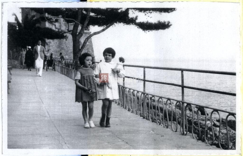 iscrizioni | sul foglio su cui è incollata la fotografia l'indicazione manoscritta "Rita Bayona è la bambina con il grembiulino bianco e la bambola al braccio sinistro/ Foto scattata da un fotografo professionista sulla passeggiata Anita Garibaldi di Nervi GE nella primavera del 1935/ Sullo sfondo la torre Groppallo" e "Dall'album dei ricordi di Giuliana l'amica di Rita, accanto a lei nella fotografia" |