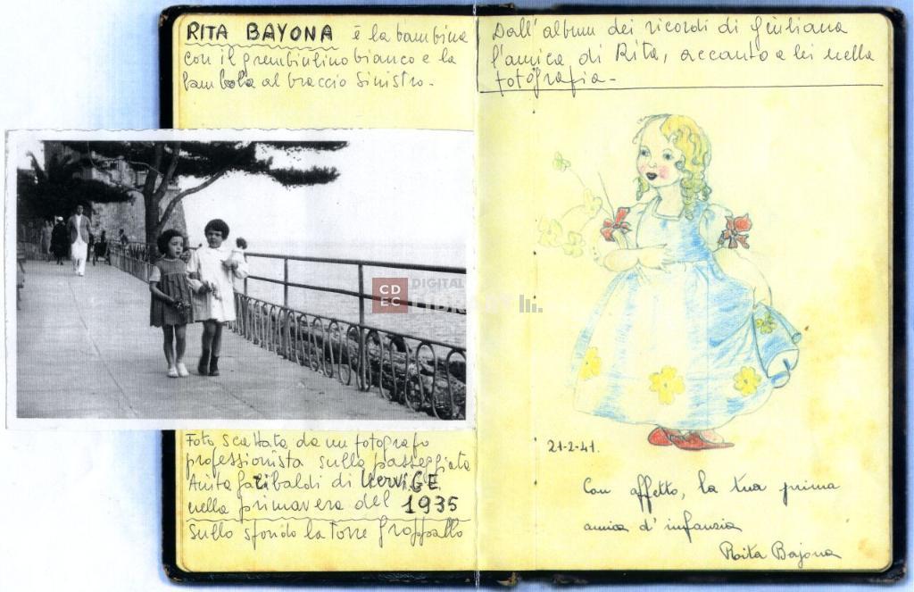 notizie storico-critiche | La fotografia è incollata sulla fotocopia a colori di una pagina di un libro dei ricordi infantile su cui è presente un disegno di Rita Bayona datato 21 febbraio 1941 e la dedica della stessa Rita "21-2-41 Con affetto, la tua prima amica d'infanzia/ Rita Bayona". Rita Bayona fu arrestata a Nervi il 19 aprile 1944 e successivamente deportata. |