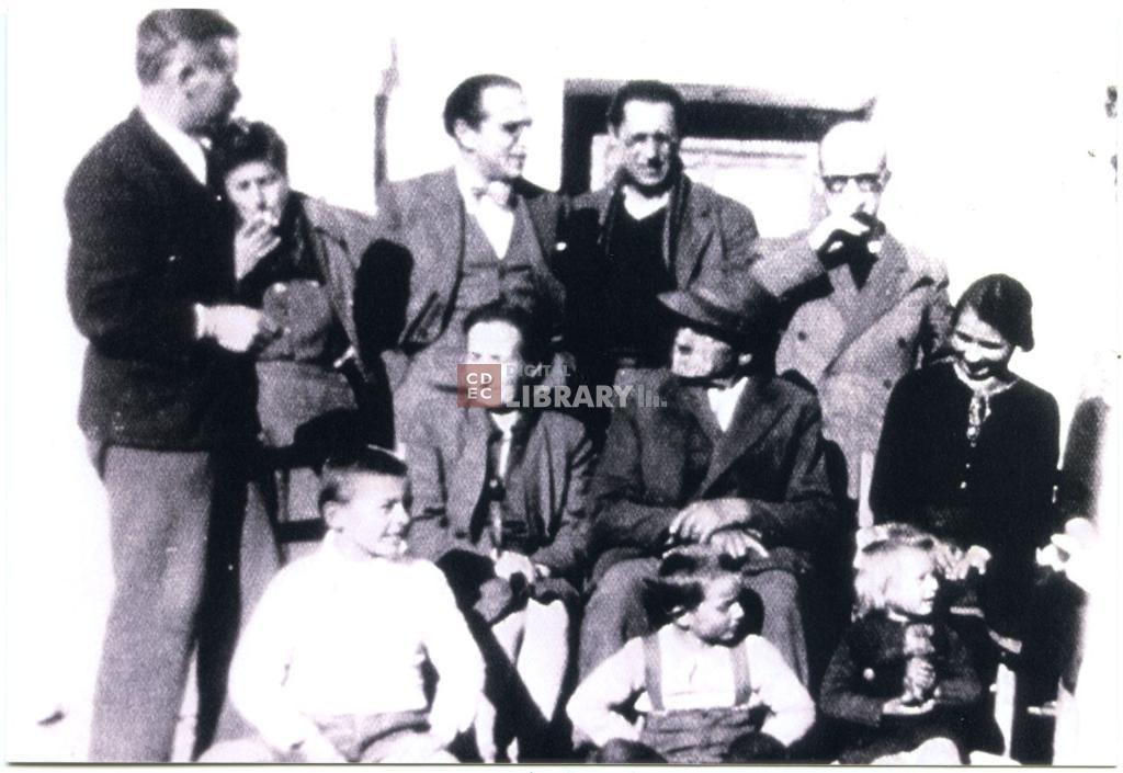 osservazioni | Nella fotografia si riconoscono in piedi al centro Siegfried Schwarz, seduta davanti a lui Theresia Pories in Burger e in piedi il primo a sinistra il signor Haberman, così come riportato nella didascalia che accompagna la fotografia nel libro "Biancastella" (1997) e reca il seguente testo: "Picture taken in Moiola, Italy, in front of barn Italian farmers provided for Jewish refugees, October 1943. People in top row are, from left, a farmer; a Jewish refugee lady; Seigfried Schwarz (who was executed by the Brigate Nere on the last day of the war); the refugee lady's husband; and another refugee, who was later shot by a Nazi patrol. My mother is the lady seated at left in the center row" |