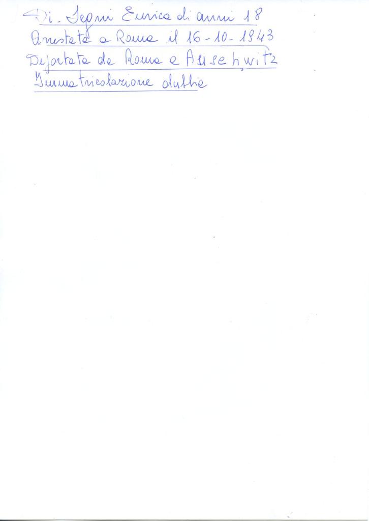 | iscrizioni | sul verso del supporto l'indicazione manoscritta: "Di Segni Enrica di anni 18/ Arrestata a Roma il 16-10-1943/ Deportata da Roma a Auschwitz/ Immatricolazione dubbia" |