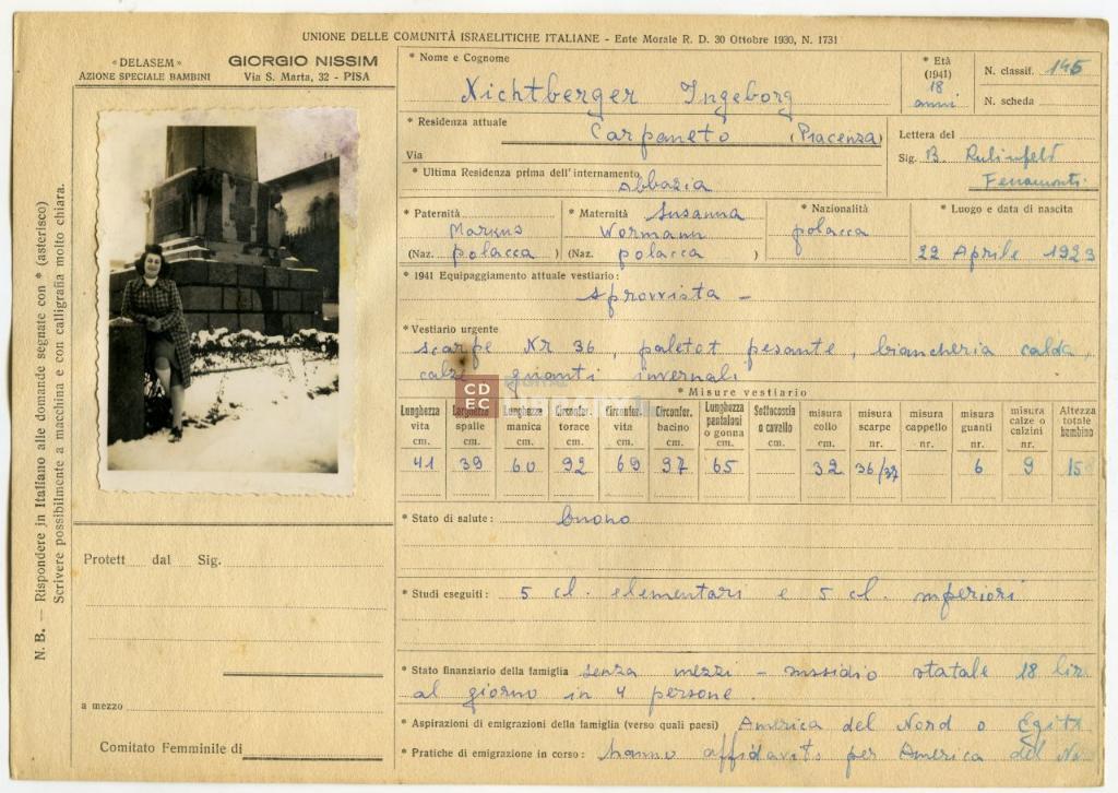 | osservazioni | Il ritratto fotografico di Dina (Ingeborg) Nichtberger correda la scheda identificativa compilata dalla "Delasem" Azione speciale bambini con i dati personali dell'assistito al 1941 |