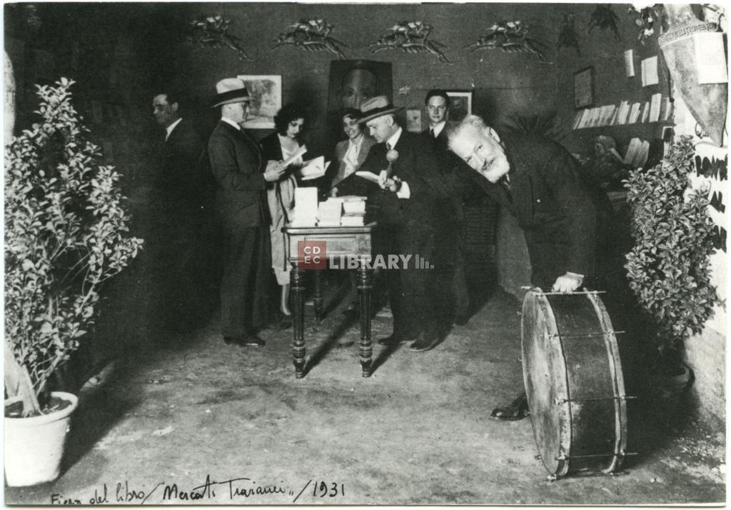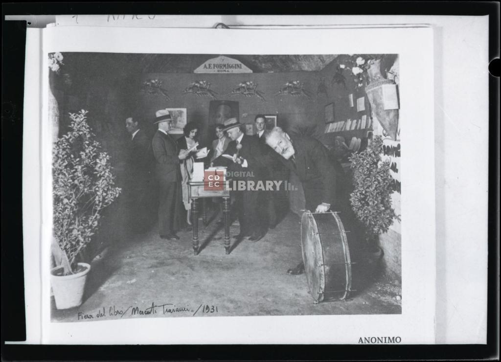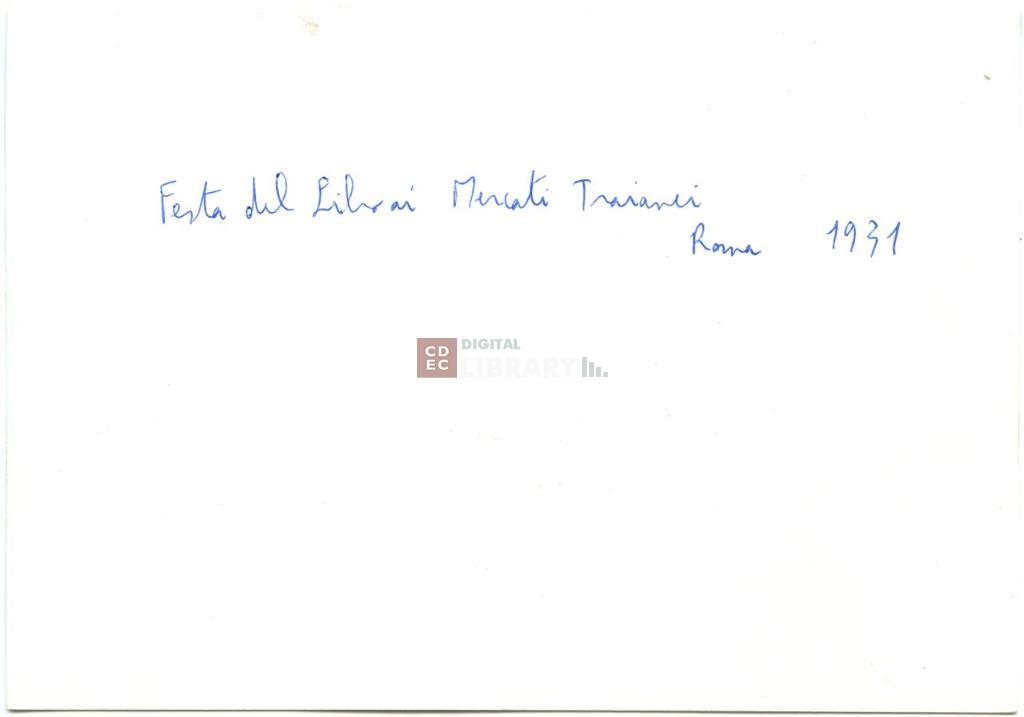 iscrizioni | Nell'immagine in basso a sinistra la didascalia fotografica "Fiera del Libro/ Mercati Traianei/ 1931" e in alto al centro la targa con la scritta "A.F. Formiggini" |