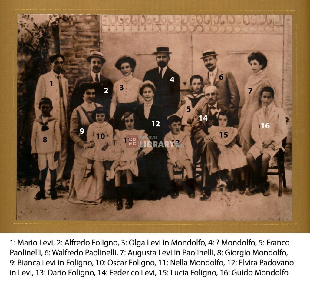 | osservazioni | Nella fotografia si riconoscono 1: Mario Levi, 2: Alfredo Foligno, 3: Olga Levi in Mondolfo, 4: [?] Mondolfo, 5: Franco Paolinelli, 6: Walfredo Paolinelli, 7: Augusta Levi in Paolinelli, 8: Giorgio Mondolfo, 9: Bianca Levi in Foligno, 10: Oscar Foligno, 11: Nella Mondolfo, 12: Elvira Padovano in Levi, 13: Dario Foligno, 14: Federico Levi, 15: Lucia Foligno (poi coniugata in Segre), 16: Guido Mondolfo. A Pergola nelle Marche vi era la casa di famiglia dei Levi |