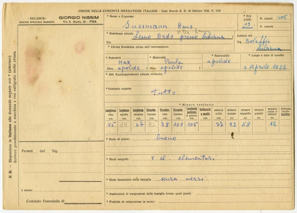 | osservazioni | Il ritratto fotografico correda la scheda identificativa compilata dalla "Delasem" Azione speciale bambini con i dati personali dell'assistito al 1941; un'altra scheda d'archivio risulta priva di fotografia |