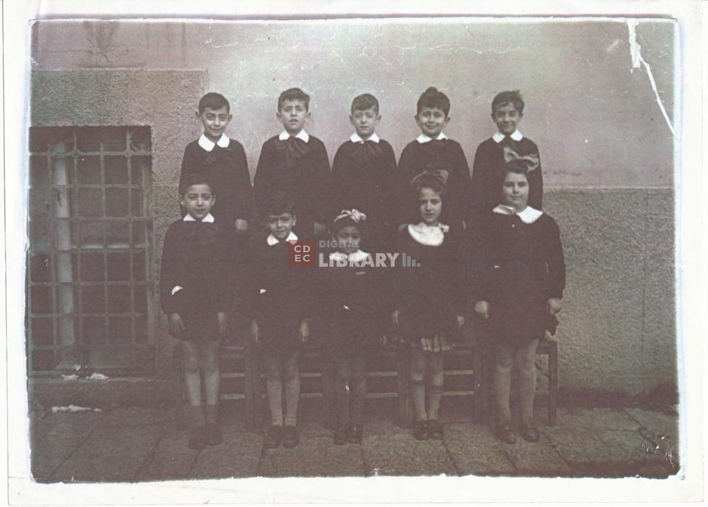 | osservazioni | Allievi della sezione israelitica nella scuola elementare Vanvitelli al Vomero a Napoli; si trattava di una classe mista unica che riuniva dieci alunni dalla prima alla quinta elementare, creata intorno al 1939 dopo l'emanazione delle leggi antiebraiche. Nella fotografia si riconoscono in alto da sinistra Alberto Bivash, Dario Foà, Tullio Foà, Giorgio Formiggini, Davide (Dino) Hasson (poi deportato da Salonicco); in basso da sinistra Roberto Piperno, Elio Benusiglio, Matilde (Tilde) Benusiglio, Ada Defez, Anita Gerschfeld. [Per il riconoscimento si veda l'intervista ad Alberto Bivash, in Gabriella Gribaudi (ricerca e cura scientifica), "Dal cancello secondario: storie di ebrei a Napoli", progetto dell'Università degli studi di Napoli Federico II, Dipartimento di Sociologia, regia di Fabio Esposito e Alessandra Forni, da minuti 08.39 a minuti 10.03 (video caricato su Youtube)] |