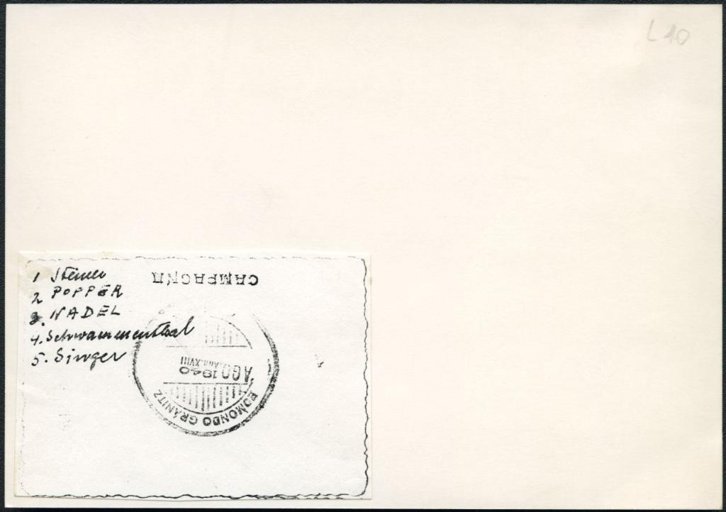 | osservazioni | Nella fotografia si riconoscono 1: [?] Steiner, 2: Fritz Popper, 3: Heinz Marcus Nadel, 4: Leiser (Leo) Schwammenthal, 5: Milan Singer |