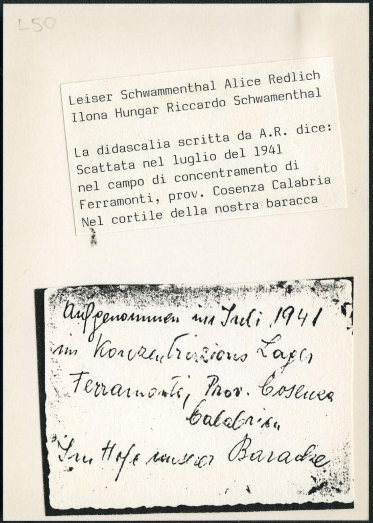 | iscrizioni | sul verso del supporto la didascalia manoscritta in tedesco da Alice Redlich Schwamenthal "Aufgenommen in Juli 1941 in Konzentrations Lager Ferramonti, Prov. Cosenza Calabria Im höfe unsere baracke" [traduzione: "Scattata nel luglio 1941 nel campo di concentramento di Ferramonti, prov. Cosenza Calabria Nel cortile della nostra baracca"] |