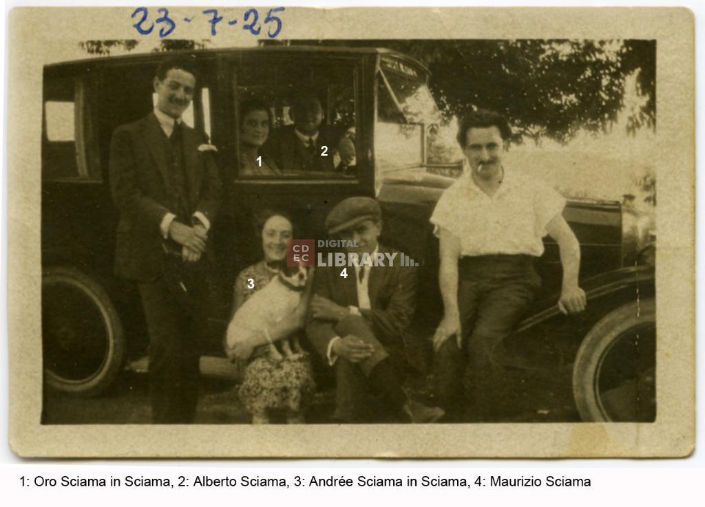 | osservazioni | Nella fotografia si riconoscono 1: Oro Sciama in Sciama (madre del donatore Roger Sciama), 2: Alberto Sciama (padre del donatore Roger Sciama), 3: Andrée Sciama in Sciama (zia materna del donatore Roger Sciama), 4: Maurizio Sciama (zio paterno del donatore Roger Sciama) Stampa fotografica proveniente dall'album fotografico beige. |