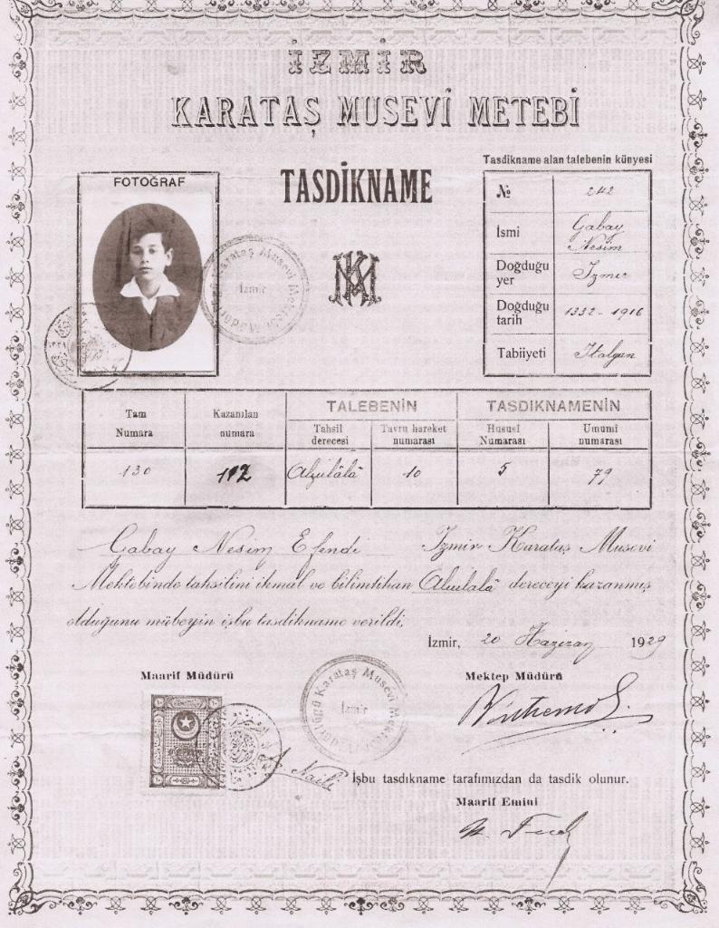 | osservazioni | Testo della didascalia a pagina 63 di "Vita e ricordi di un giudeo-spagnolo: Primo Volume dal 1916 al 1945" di Nissim Gabbai: "Certificato di studi rilasciato dalla scuola ebraica di Karatas (Béné Berith) nel 1929" - Nissim Gabbai, all'epoca tredicenne, viene giudicato "lodevole" con una votazione di 112/130. Il documento, rilasciato dal direttore della scuola e controfirmato dall'ispettore e dal direttore della sezione di Smirne del Ministero dell'Istruzione, fu redatto in lingua turca con caratteri latini e marca da bollo in caratteri arabi. |