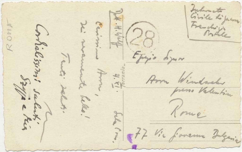 | iscrizioni | sul verso del supporto: "Internato civile di guerra [...]" - "Aron Windwehr presso Valentini, Roma, via Giovanna di Bulgaria 77" - "4 XI" |