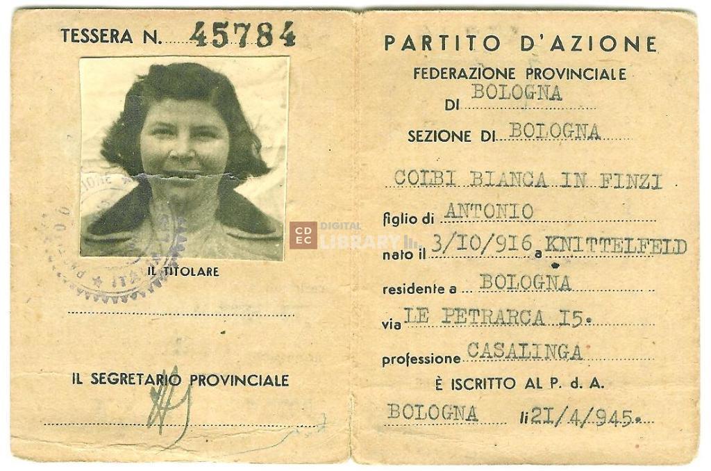 titolo attribuito | Tessera di riconoscimento della Federazione provinciale di Bologna del Partito d'Azione di Colbi Bianca in Finzi |