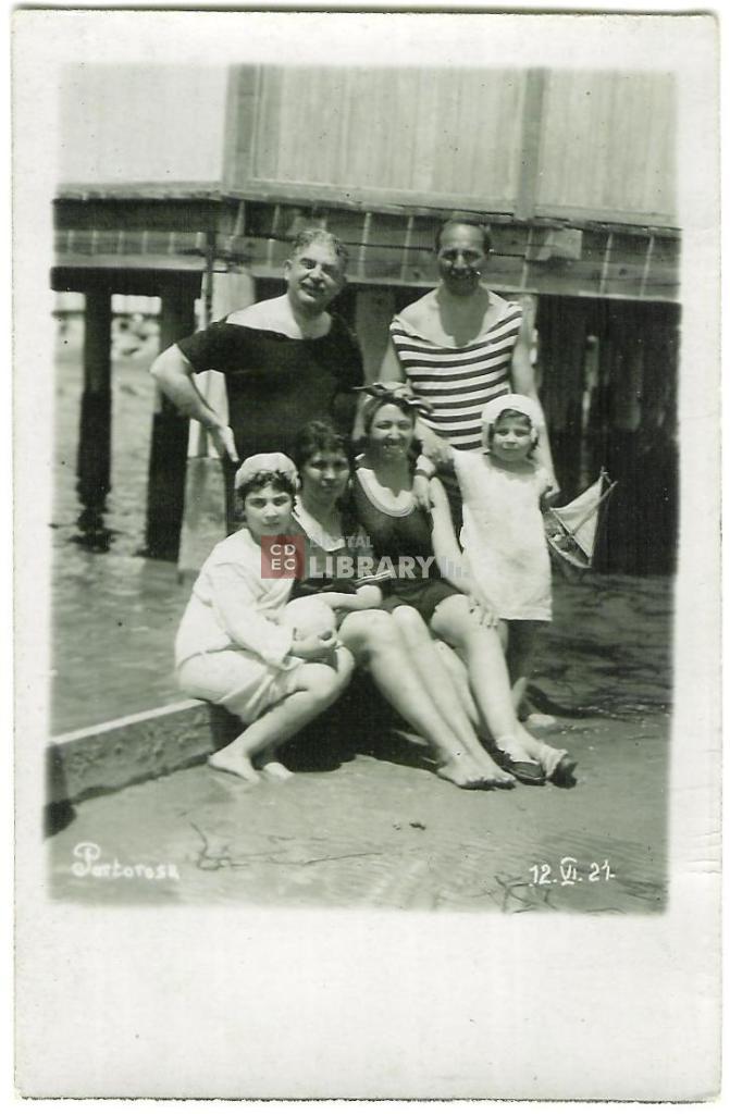osservazioni | Da sinistra in prima fila Rosita Colbi (poi coniugata Toaff), Giusta Levi in Colbi, Bianca Fano (identificata dal confronto con la foto inv. 612-028), Bianca Colbi bambina (poi coniugata Finzi); da sinistra in piedi in seconda fila Antonio (detto Toni) Colbi e un uomo non identificato |