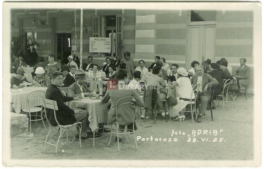 titolo attribuito | La famiglia Colbi con amici seduti al tavolino di un locale di Portorose insieme ad altri avventori |