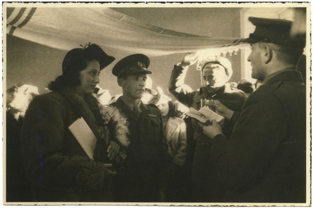 | osservazioni | Da sinistra in primo piano Renata Caminada in Schek, Arié Schek (soldato della Brigata palestinese), un uomo non identificato che sorregge la kuppàh, il rabbino militare (di origine ungherese) che tiene nelle mani il libro e il bicchiere |