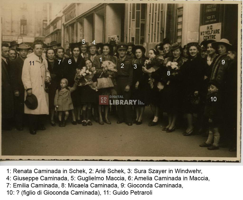 | osservazioni | Nella fotografia si riconoscono 1: la sposa Renata Caminada in Schek, 2: lo sposo Arié Schek (soldato della Brigata palestinese), 3: Sura Szayer in Windwehr, 4: Giuseppe Caminada (fratello della sposa), 5: Guglielmo Maccia (marito di Amelia Caminada [?] - avvocato e partigiano nella provincia di Como, durante la guerra aiutò numerosi ebrei a sconfinare in Svizzera e per questo riconosciuto Giusto fra le Nazioni), 6: Amelia Caminada [?] in Maccia (sorella della sposa), 7: Emilia Caminada (sorella della sposa), 8: Micaela Caminada (sorella della sposa), 9: Gioconda Caminada in Tagliabue (sorella della sposa), 10: Silvio Tagliabue (figlio di Gioconda Caminada), 11: Guido Petraroli (marito di Elisa Caminada). In secondo piano (accanto al negozio di Panarello), si vede l'ingresso al circolo ufficiali della Brigata ebraica di via Cantù. |