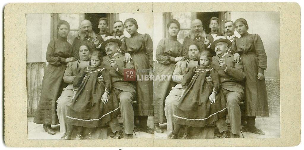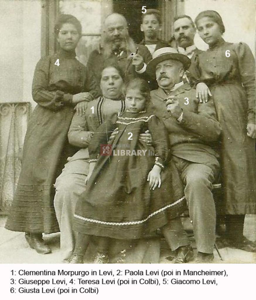 osservazioni | Nella fotografia si riconoscono 1: Clementina Morpurgo in Levi, 2: Paola Levi (poi coniuigata Mancheimer), 3: Giuseppe Levi, 4: Teresa Levi (poi coniugata Colbi), 5: Giacomo Levi, 6: Giusta Levi (poi coniugata Colbi). Sono inoltre ritratti due uomini, forse parenti non identificati della famiglia Levi |