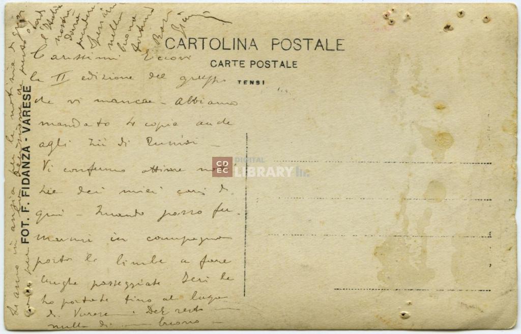 iscrizioni | sul verso del supporto lunga dedica manoscritta: "Carissimi, eccovi la II. edizione del gruppo che vi manca. Abbiamo mandato la copia anche agli zii di Tunisi. Vi confermo ottime notizie dei miei cari di qui. Quando posso fermarmi in campagna, porto le bimbe a fare lunghe passeggiate. Ieri le ho portate fino al lago di Varese. Del resto nulla di buono. Siamo in ansia per le notizie di guerra anche per la decisione che presto o tardi l'Italia nostra dovrà prendere. Speriamo nella buona fortuna. Baci, Giacomo" |