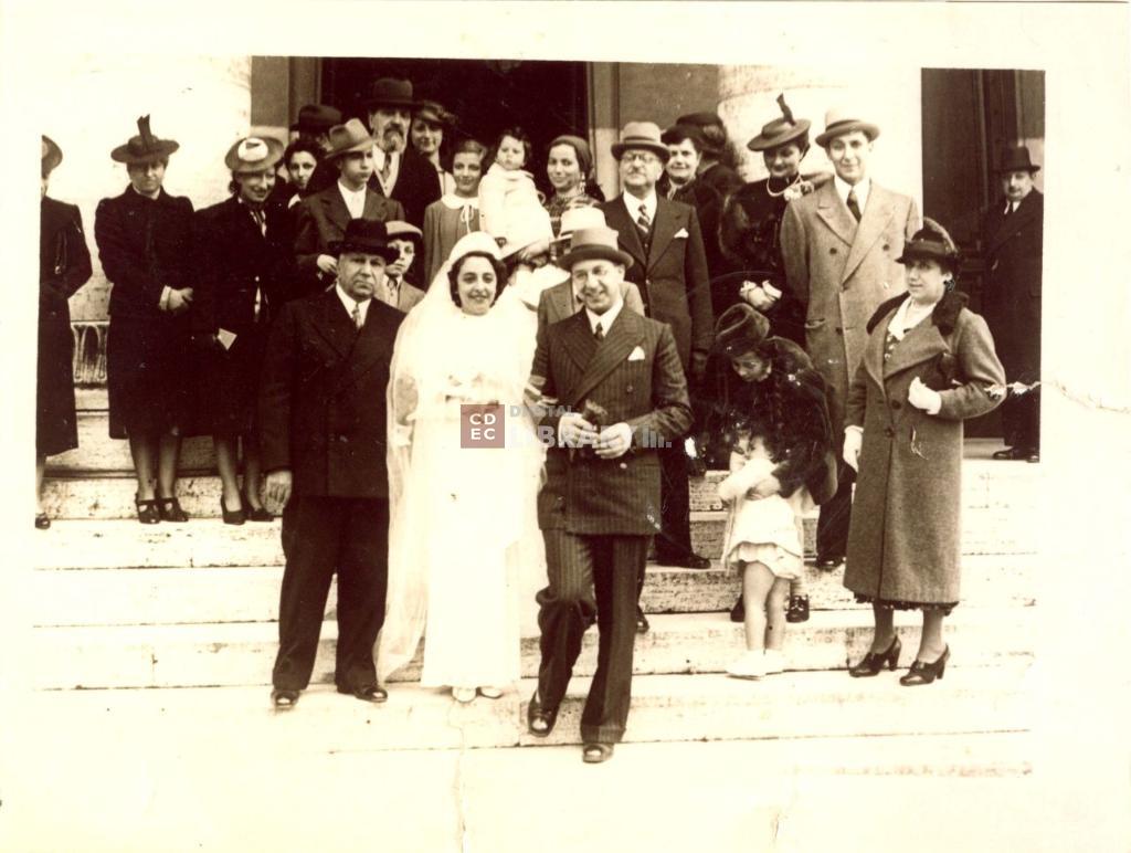 titolo attribuito | Gli sposi Vera Piperno e Carlo Pontecorvo insieme ai parenti e amici all'uscita dal Tempio Maggiore di Roma |