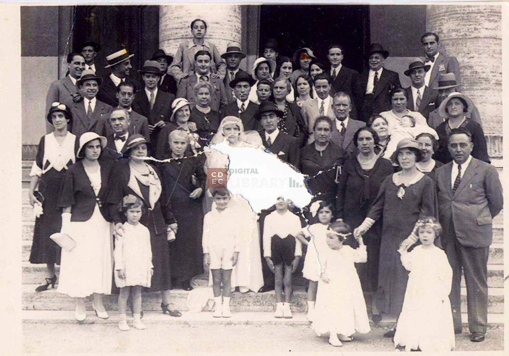 | osservazioni | Al centro del gruppo la sposa Elena Di Cave in Spizzichino (con abito e velo bianco) e lo sposo Pacifico Spizzichino (alla sinistra della sposa), entrambi deportati La fotografia presenta al centro, proprio in corrispondenza degli sposi, una profonda lacerazione dovuta a una pugnalata inferta dai nazisti il giorno dell'arresto della famiglia Spizzichino, avvenuto il 16 ottobre 1943 |