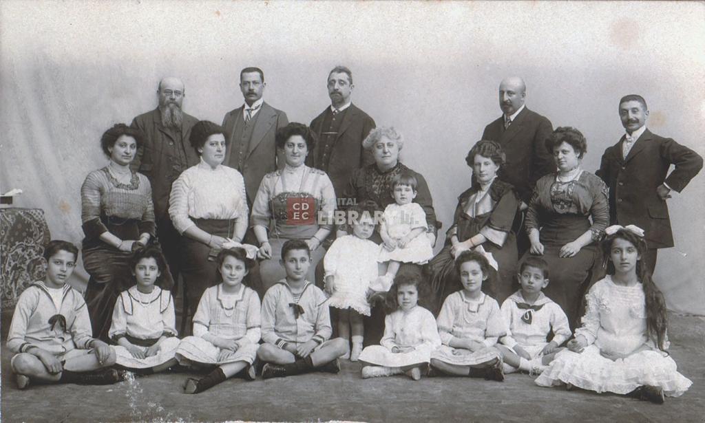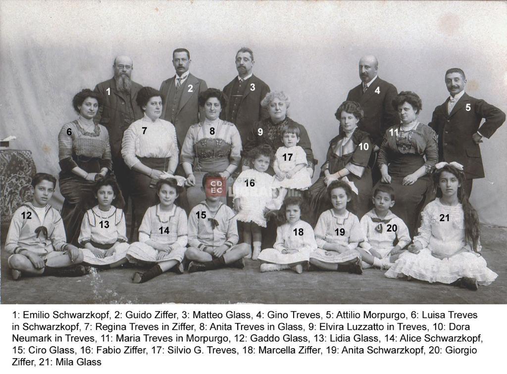 osservazioni | Nella fotografia si riconoscono 1: Emilio Schwarzkopf, 2: Guido Ziffer, 3: Matteo Glass, 4: Angelo Davide (detto Gino) Treves, 5: Donato Moisè (detto Attilio) Morpurgo, 6: Luisa Treves in Schwarzkopf, 7: Regina Treves in Ziffer, 8: Anita Treves in Glass, 9: Elvira Luzzatto in Treves, 10: Dora Neumark in Treves, 11: Maria Treves in Morpurgo, 12: Gaddo Glass, 13: Lidia Glass, 14: Alice Schwarzkopf, 15: Ciro Glass, 16: Fabio Ziffer, 17: Silvio Giulio Treves, 18: Marcella Ziffer, 19: Anita Schwarzkopf, 20: Giorgio Ziffer, 21: Mila Glass |