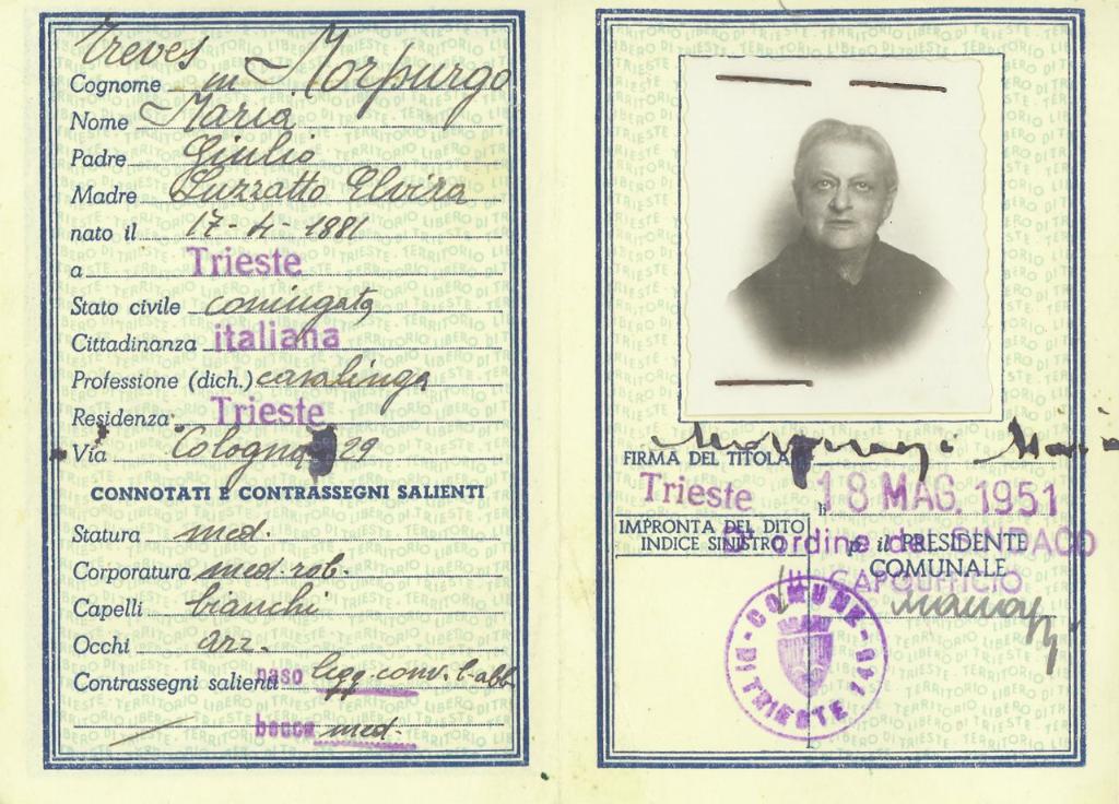| osservazioni | Carta d'identità di Maria (Miriam) Treves in Morpurgo, emessa dal Territorio Libero di Trieste |