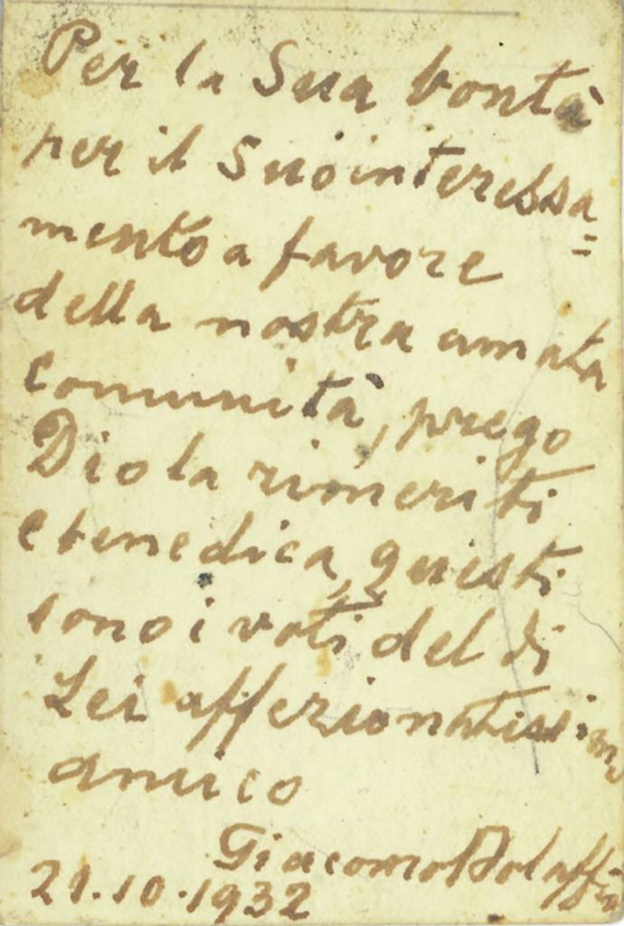 | iscrizioni | sul verso del supporto la dedica manoscritta: "Per la sua bontà per il suo interessamento a favore della nostra amata comunità, prego Dio la rimeriti e benedica, questi sono i voti del di Lei affezionatissimo amico/ Giacomo Bolaffio/ 21-10-1932" |