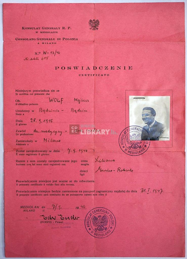 titolo attribuito | Certificato del Consolato polacco di Milano di Wolf Mojzesz |