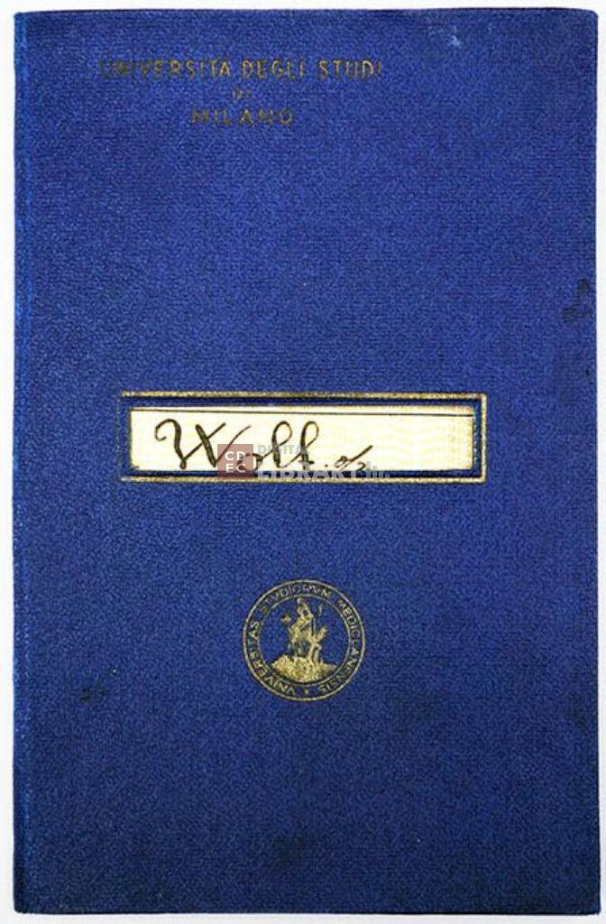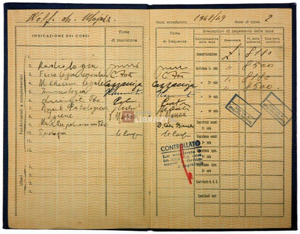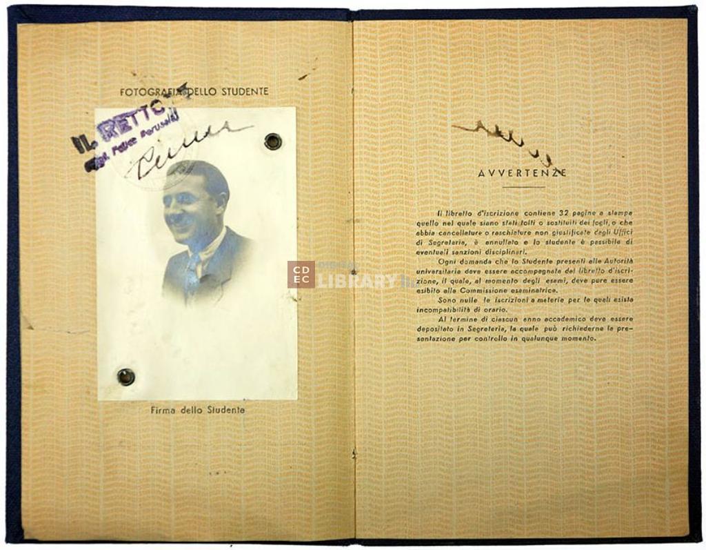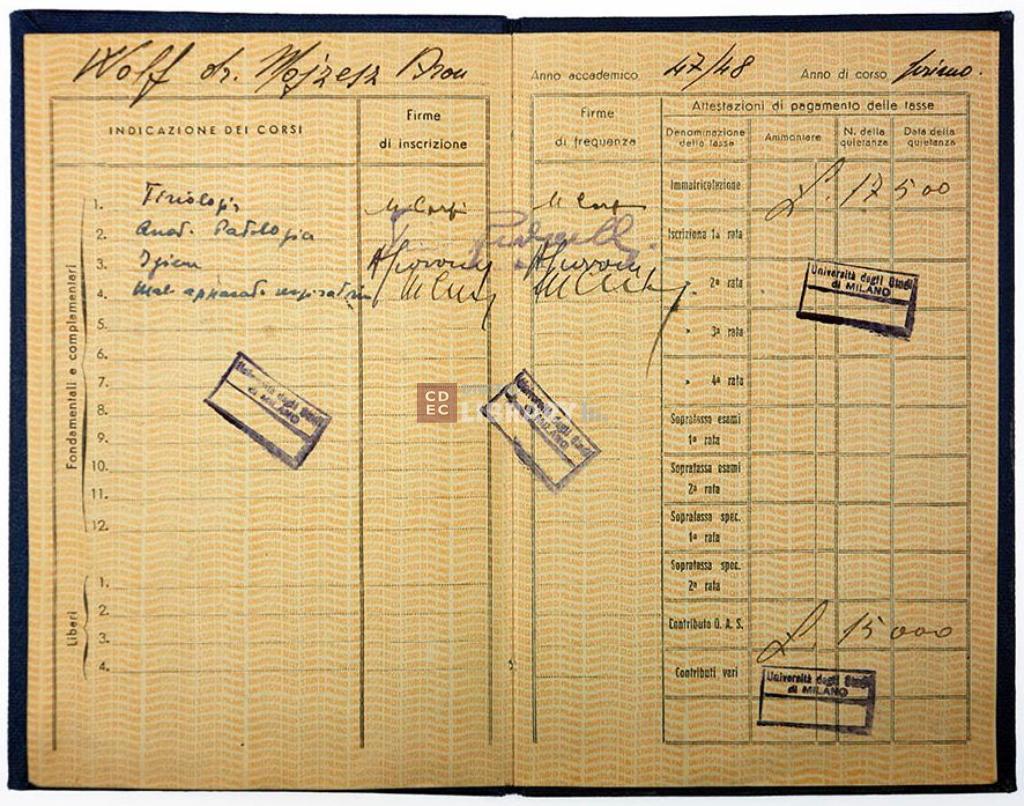 osservazioni | Il libretto universitario, emesso dall'Università degli Studi di Milano, era valevole per gli anni accademici 1947-1948 e 1948-1949, rispettivamente primo e secondo anno di corso del biennio di specializzazione di Mojzesz Aron (detto Mietek) Wolf. Il medesimo scatto fotografico fu utilizzato anche per altri documenti d'identità (vedi inv. 674-059) |