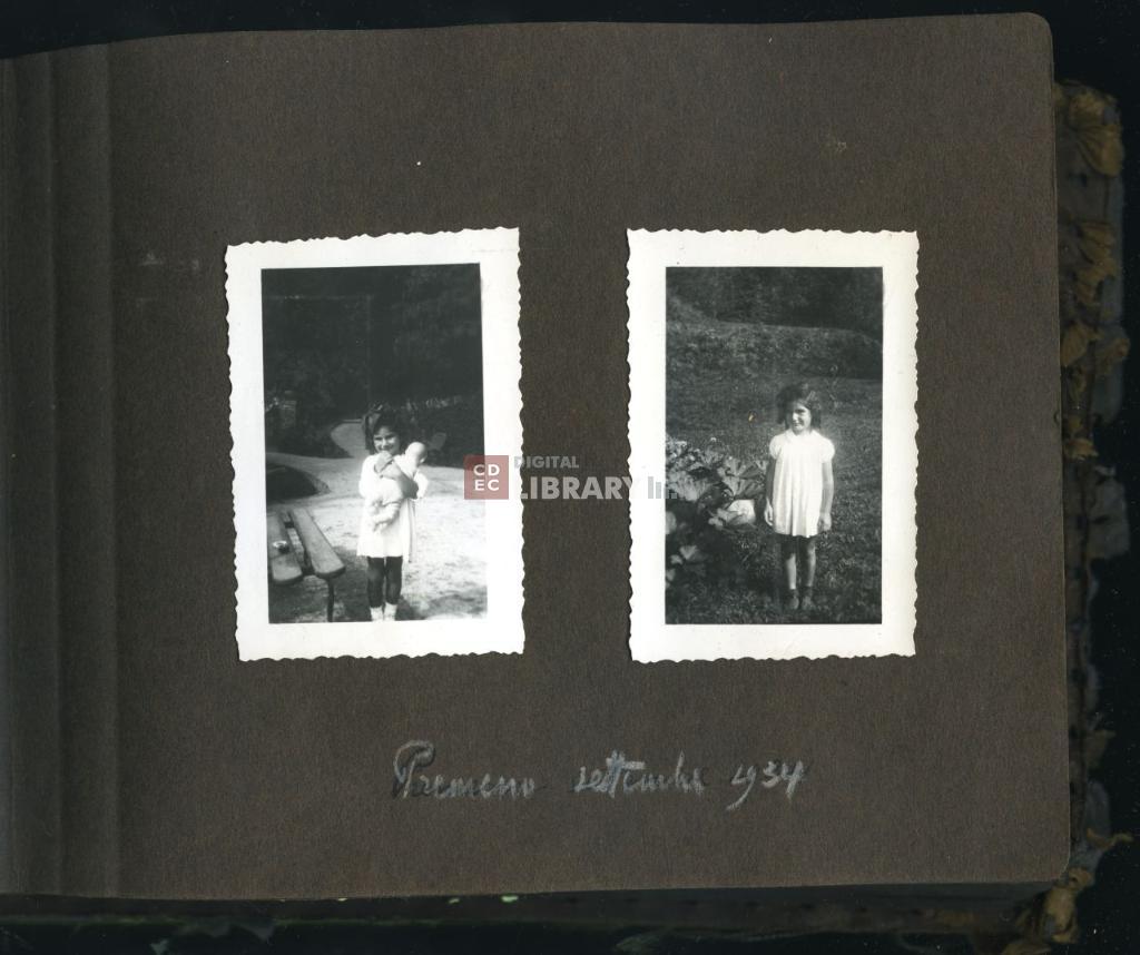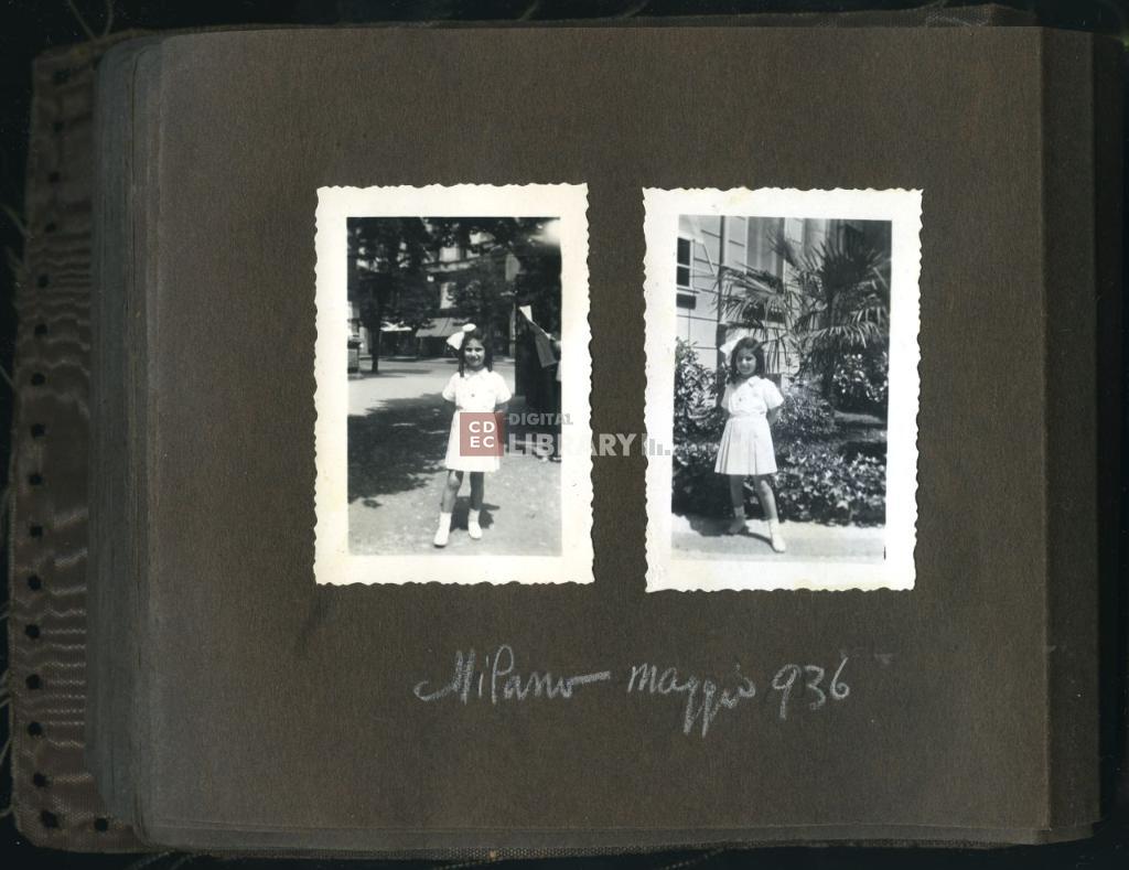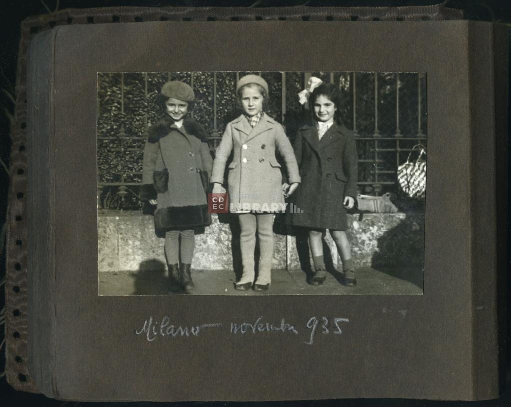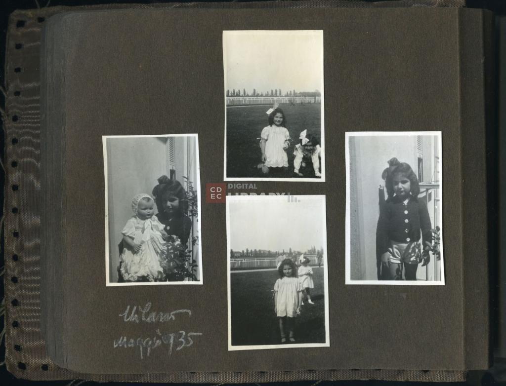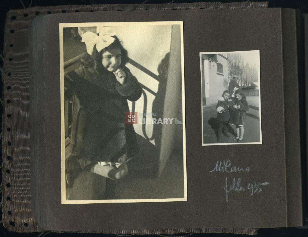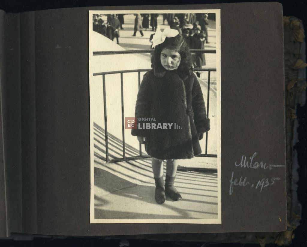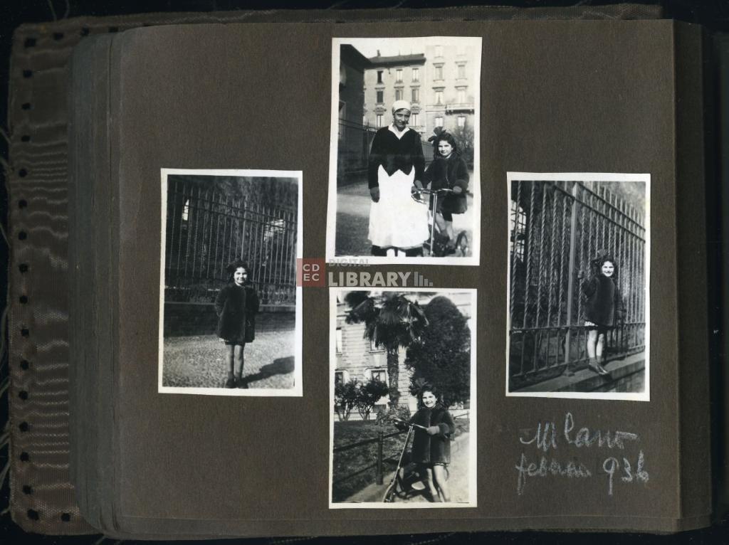 osservazioni | L'album raccoglie le fotografie dell'infanzia di Liliana Segre (poi coniugata Belli Paci), dall'età di quattro anni fino al raggiungimento dei nove anni di età. Fu confezionato dal padre di Liliana, Alberto Segre e reca le didascalie manoscritte dal medesimo. Liliana Segre è ripresa sia in ritratti singoli, sia insieme alla balia Caterina De Guz, alla tata tedesca (una ragazza ebrea in fuga dalla Germania verso gli Stati Uniti, che nel 1936 viene incaricata di sostituire la balia Caterina quando quest'ultima decide di lasciare il lavoro presso la famiglia Segre), al padre Alberto Segre, alla nonna materna Bianca Levi in Foligno, al nonno paterno Giuseppe (Pippo) Segre, agli zii paterni Amedeo Segre ed Enrica Fumagalli in Segre, ai cugini Marcella Lovvy, Giancarlo e Galeazzo Foligno e Fiorella Segre con i genitori Luciano Segre e Rosina Iaffe in Segre, agli amici d'infanzia Maria Grazia Paolinelli, Nicoletta Braibanti (poi coniugata Valletti), Giorgio Cesati Cassin e Marisa Cappellini, agli amici di famiglia Ornella Calabi, il signor Benjamin (un ebreo tedesco, poi suicidatosi), la signora Carla (coniugata Aguzzi de Villeneuve), Denise Canetto in Escobedo e la figlia. In alcuni scatti fotografici Liliana è raffigurata sul suo adorato triciclo che le fu regalato quando aveva quattro anni e che lei considera il suo primo ricordo ("Fino a quando la mia stella brillerà", p. 17). Alle pagine 77 e 78 viene riportata una data errata: da un confronto con altre fotografie si può presumere che questi scatti non furono eseguiti nel dicembre 1938 ma nell'aprile 1939. Liliana Segre, il padre Alberto e i nonni paterni Olga e Giuseppe Segre furono deportati ad Auschwitz nel 1944. |