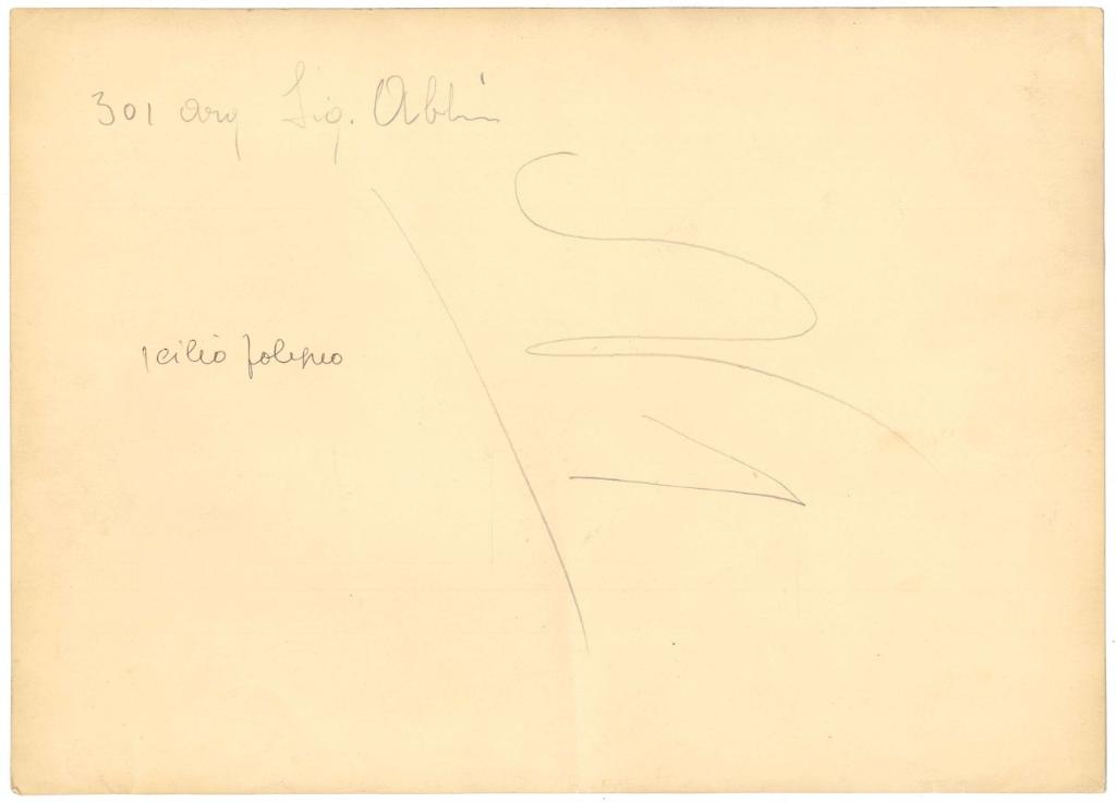 | iscrizioni | nell'immagine in basso a sinistra la firma a inchiostro rosso di "Renata Fermi" - sul verso del supporto le indicazioni manoscritte a matita "301 arg. Sig. Ab[...]/ Icilio Foligno/ N 1" |