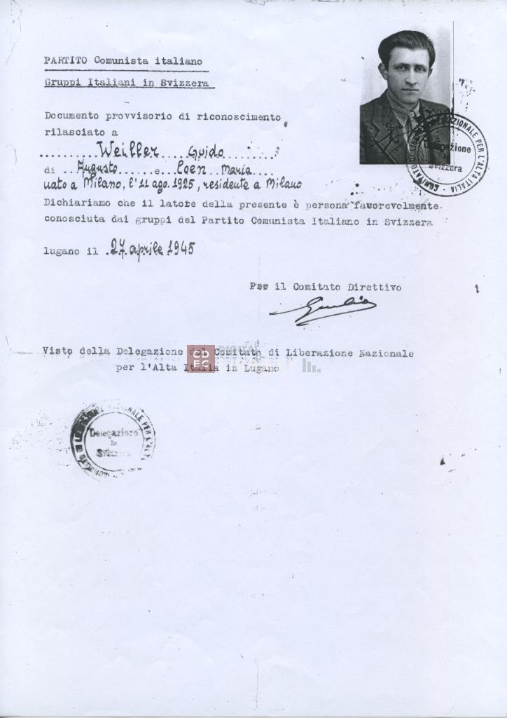 notizie storico-critiche | Il documento rilasciato a Guido Weiller riporta la dichiarazione che "il latore della presente รจ persona favorevolmente conosciuta dai gruppi del Partito Comunista Italiano in Svizzera". |