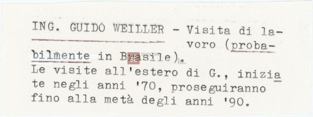 iscrizioni | sul verso del supporto l'indicazione manoscritta "Guido Weiller" - nella didascalia che accompagna la fotografia la nota dattiloscritta "Ing. Guido Weiller - Visita di lavoro (probabilmente in Brasile). Le visite all'estero di G., iniziate negli anni '70, proseguiranno fino alla metà degli anni '90" |