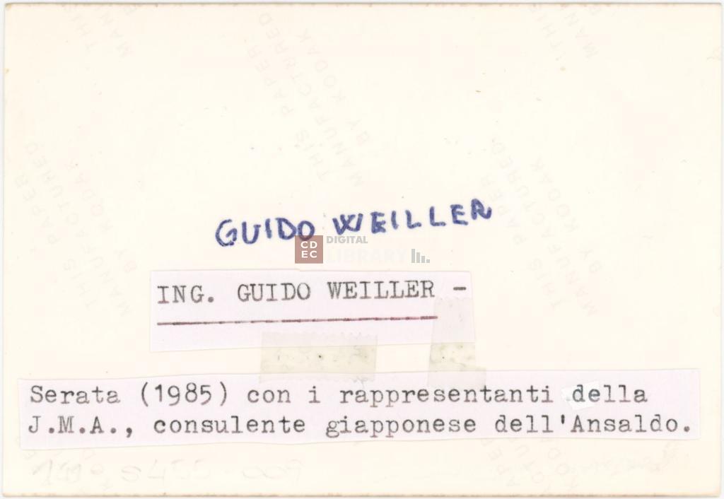 iscrizioni | nell'immagine in basso a destra la data "'85 5 31" - sul verso del supporto l'indicazione manoscritta "Guido Weiller" - Allegato alla stampa fotografica un foglio con la didascalia dattiloscritta "Ing. Guido Weiller - Serata (1985) con i rappresentanti della J.M.A., consulente giapponese dell'Ansaldo" |