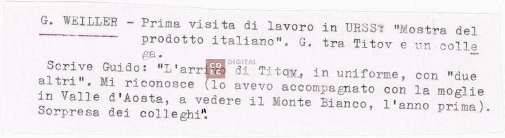 iscrizioni | sul verso del supporto l'indicazione manoscritta "Guido Weiller" - nella didascalia che accompagna la fotografia la nota dattiloscritta "Guido Weiller - Prima visita di lavoro in URSS: "Mostra del prodotto italiano". G. tra Titov e un collega/ Scrive Guido: "L'arrivo di Titov, in uniforme, con "due altri". Mi riconosce (lo avevo accompagnato con la moglie in Valle d'Aosta, a vedere il Monte Bianco, l'anno prima). Sorpresa dei colleghi" |