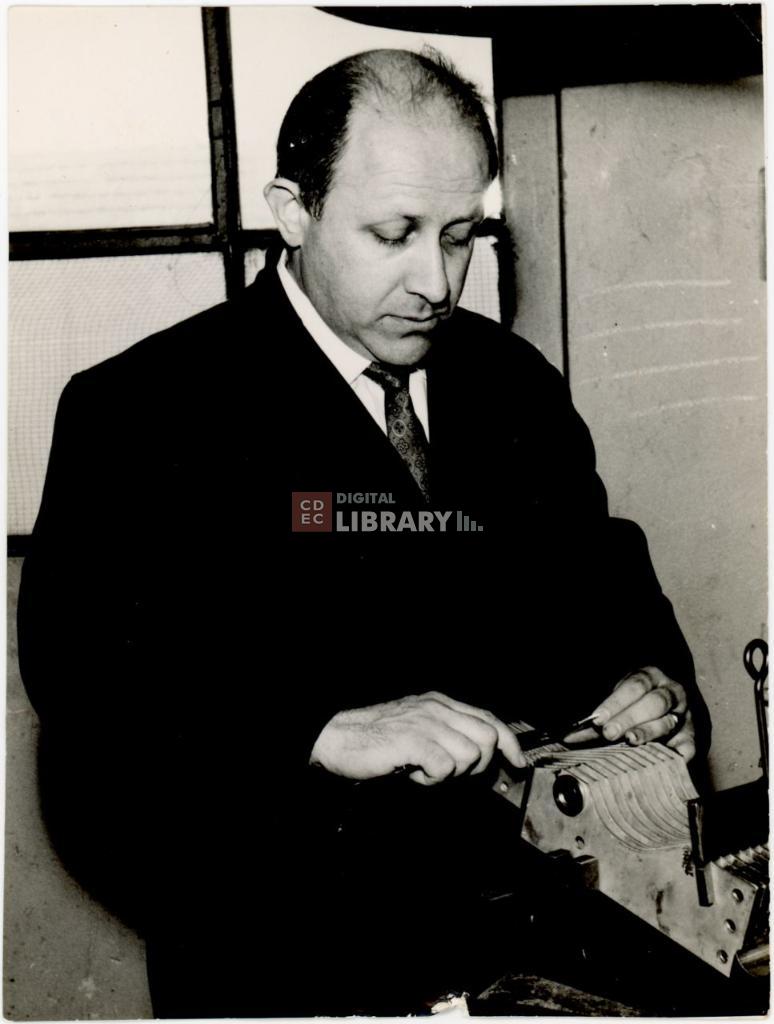iscrizioni | sul verso del supporto l'indicazione manoscritta "Guido Weiller" - nella didascalia che accompagna la fotografia la nota dattiloscritta "Ing. Guido Weiller - Alla prova di un apparecchio, poi alla scrivania" |